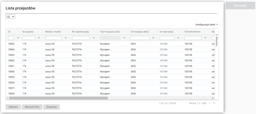 W sekcji Historia znajduje się lista przejazdów, po wybraniu elementu pojawia się możliwość zobaczeniu jego szczegółów. Jest możliwość filtrowania wyników wyświetlanych w tabelce, a także można odświeżyć i wyczyścić filtry.