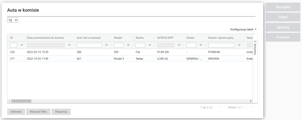 Sekcja Komis przedstawia listę aut w komisie. Jest możliwość filtrowania wyników wyświetlanych w tabelce, a także można odświeżyć i wyczyścić filtry. Obok listy znajdują się następujące funkcje: