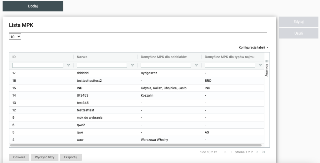 Po wejściu do sekcji zostaje wyświetlona lista MPK, obok niej znajdują się opcje: Dodawania, Edycji i Usunięcia.