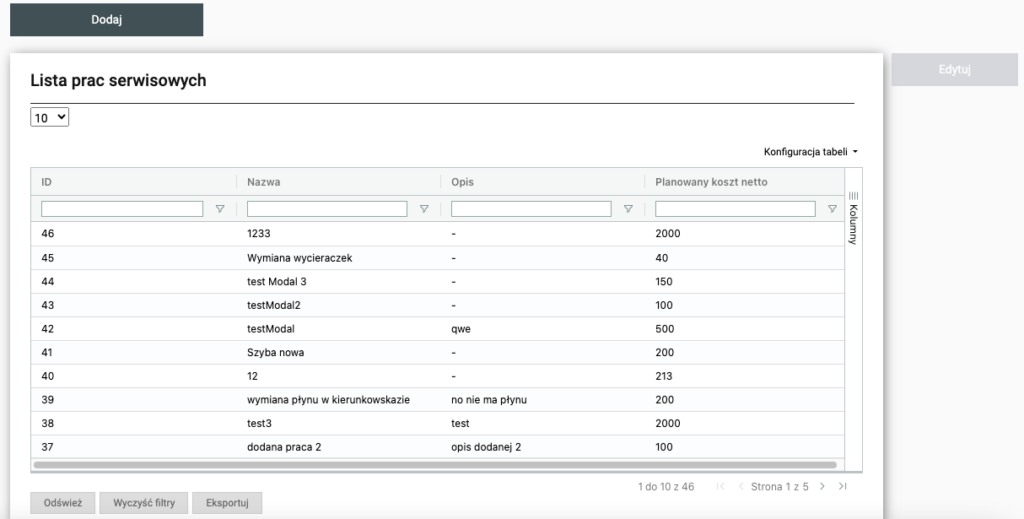 W sekcji znajduje się lista potrzebnych prac serwisowych utworzonych przez pracowników. Także znajdują się tu opcje utworzenia lub edytowania prac serwisowych.