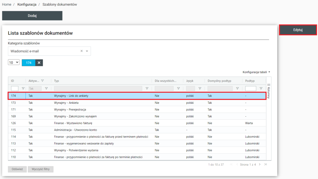 Po wybraniu elementu z listy z prawej strony staje się możliwa funkcja edycji. Po jej wybraniu zostajemy przeniesieni do do Home / Konfiguracja / Szablony dokumentów / Edycja gdzie można będzie edytować wybrany szablon dokumentów.