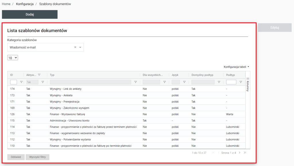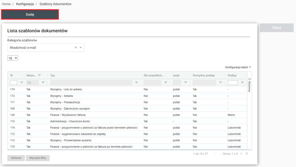 Nad listą znajduje się opcja dodania nowego szablonu dokumentu po wybraniu której zostajemy przeniesieni do Home / Konfiguracja / Szablony dokumentów / Dodawanie.