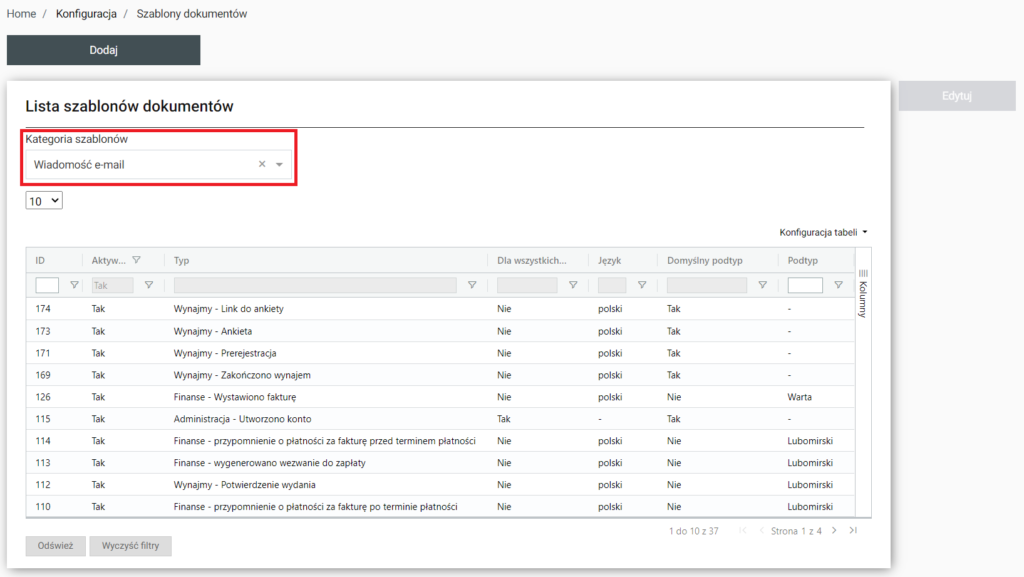 Po wejściu do sekcji zostaje wyświetlona lista szablonów dokumentów