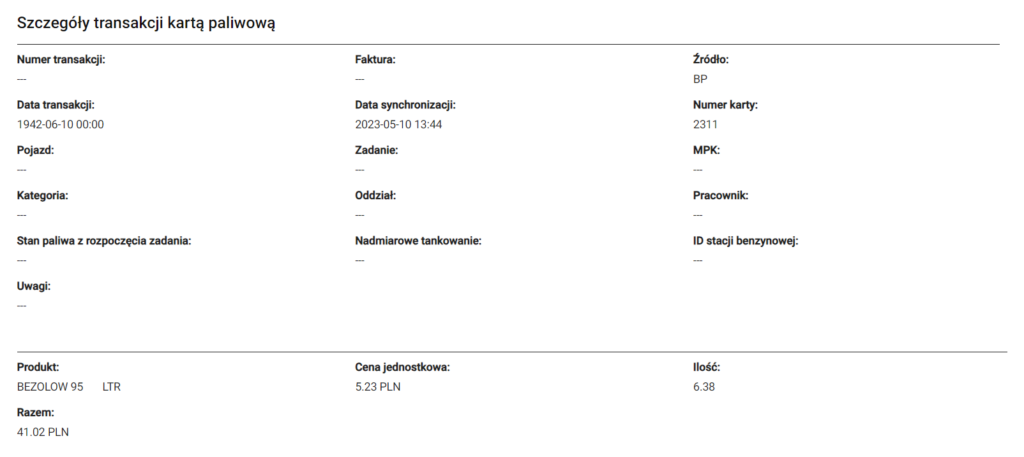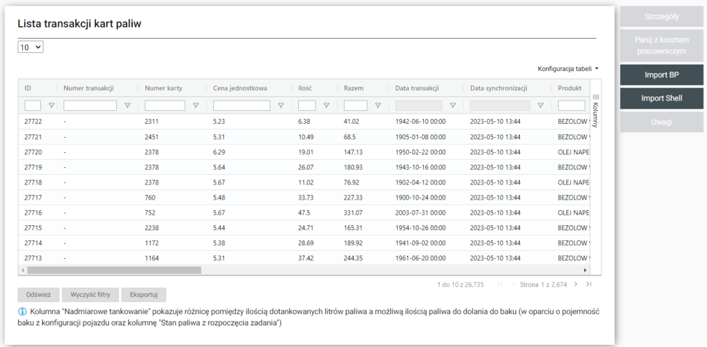 W podsekcji Transakcje znajduje się Listę transakcji kart paliw. Jest możliwość filtrowania wyników wyświetlanych w tabelce, a także można odświeżyć i wyczyścić filtry. Obok listy znajdują się następujące funkcje: