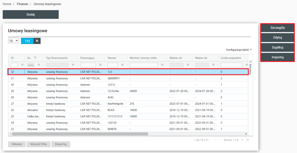Po wejściu do sekcji zostaje wyświetlona lista z Umowami leasingowymi znajdującymi się w bazie danych. Są tu też dwie opcje.