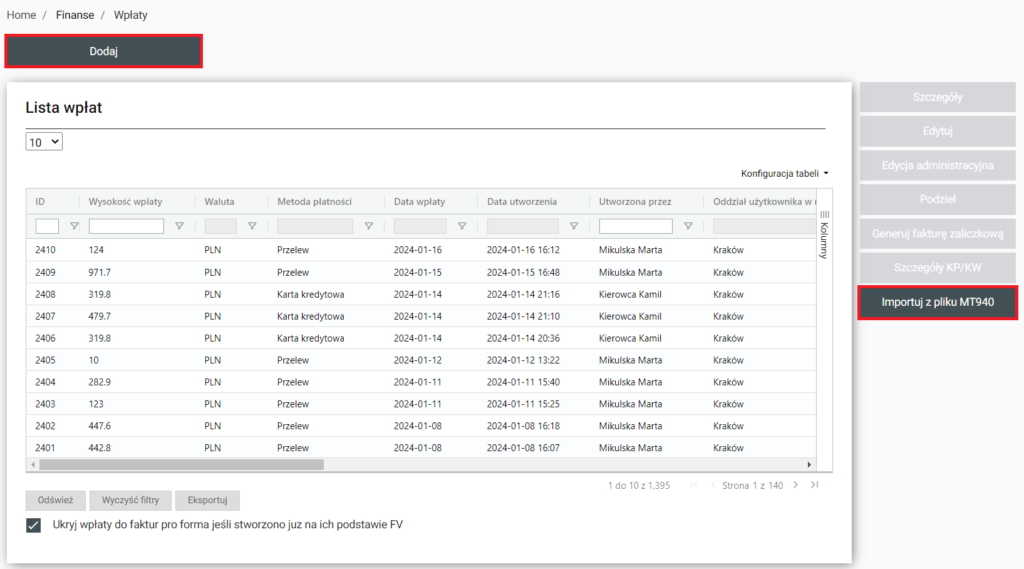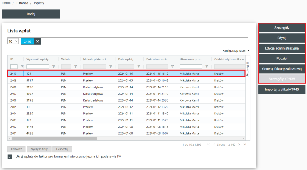 W sekcji znajduje się lista wpłat, obok znajdują się następujące funkcje: