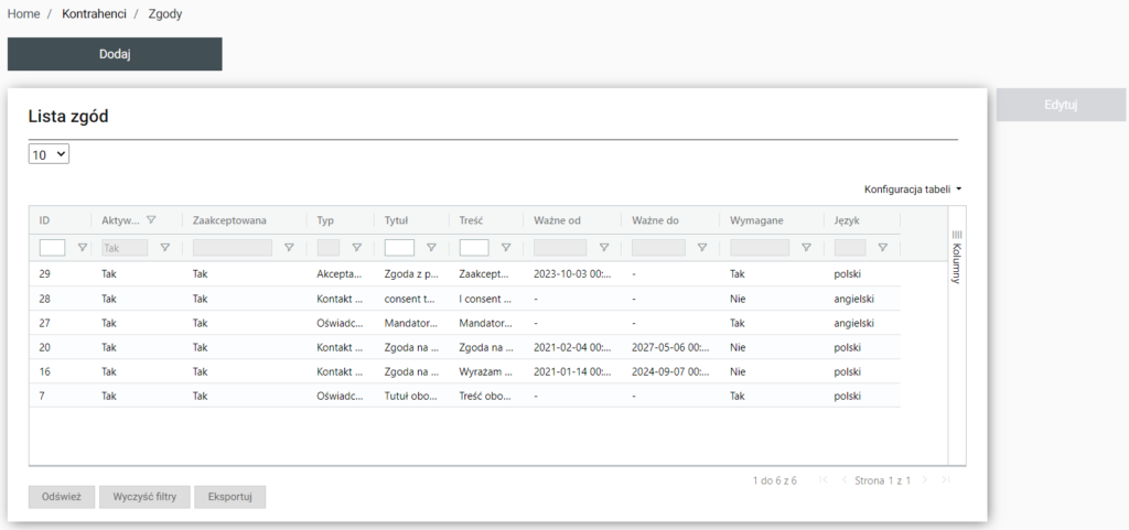 Dział zgody Przedstawia listę zgód. Jest możliwość filtrowania i sortowania wyświetlanych wyników. Obok listy znajdują się następujące funkcje: