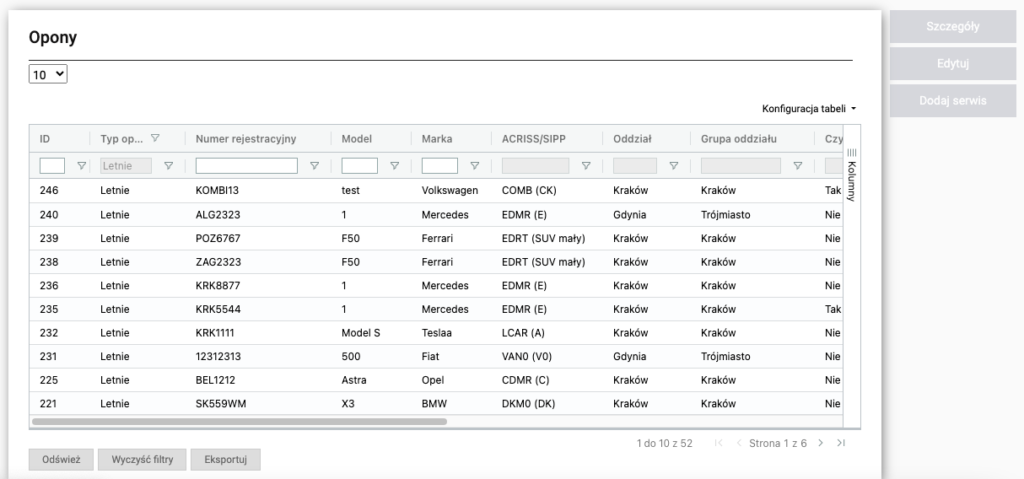 Po wejściu do sekcji zostanie wyświetlona lista opon obok niej będą znajdować się następujące funkcje: