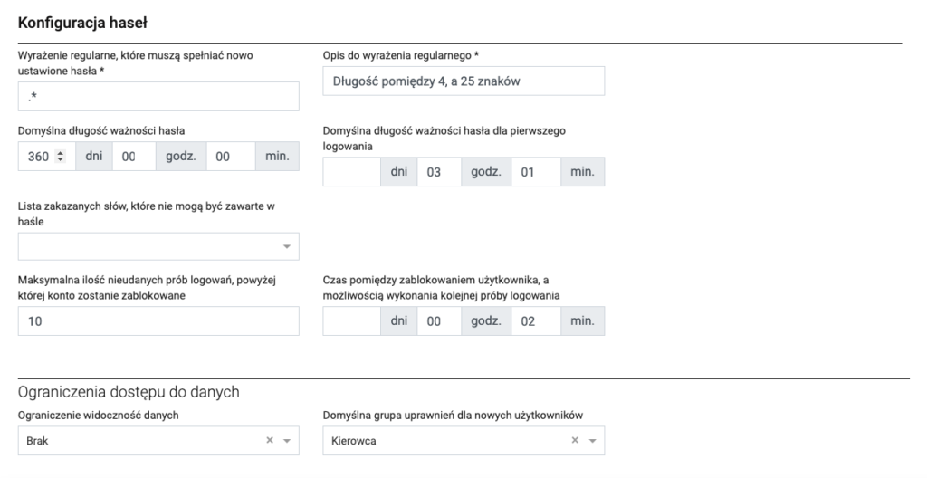 Sekcja pozwala na ustawienie zabezpieczeń dotyczących haseł użytkowników oraz ustawień domyślnych ograniczeń dostępu do danych.