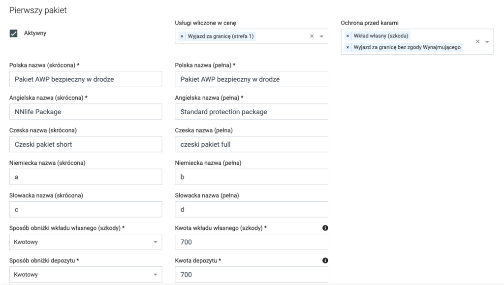 Na początku można konfigurować dane podstawowe dotyczące wybranego pakietu.