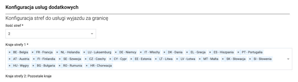 Sekcja pozwala na konfiguracja stref do usługi wyjazdu za granicę. Można tu wybrać ilość stref oraz przypisać do każdej nich odpowiednie kraje.