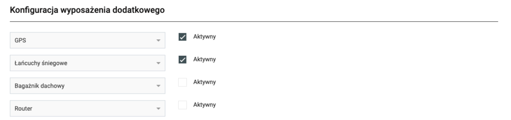 Sekcja pozwala na ustawienie stanu aktywności wyposażenia dodatkowego, czyli czy będzie dodać go do tworzonej rezerwacji.