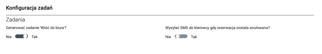 W pierwszej sekcji można ustawić czy zadanie ‘Wróć do biura’ będzie generowane oraz czy system będzie wysyłał SMS do kierowcy gdy rezerwacja została anulowana