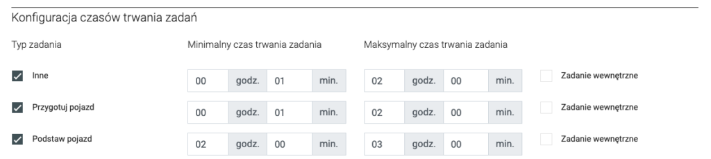 W drugiej sekcji można ustawić minimalny oraz maksymalny czas trwania zadań