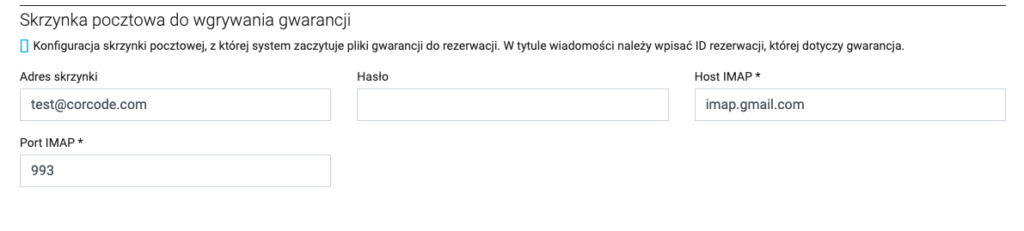 Kolejna sekcja pozwala na ustawienie skrzynki pocztowej, z której system będzie brał pliki gwarancji do rezerwacji.